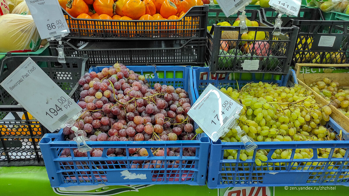 Начнем с фруктов. Виноград в магазине «Пуд» дороже чем на рынке и стоит 174-194 рубля за килограмм.
