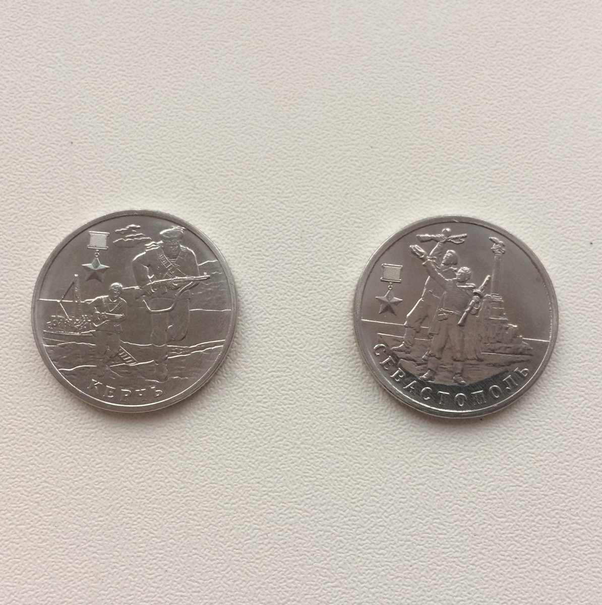 Это две 2-рублевые монеты под названием "Город-Герой Керчь" и "Город-Герой Севастополь" из серии "Города-герои". Давайте расстроим их поближе.