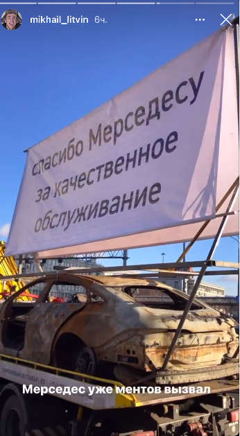 В одном из своих роликов, блогер спросил, что делать со сгоревшей тачкой и получил оригинальный ответ от подписчика: "Оставь ее у дверей дилерского центра". Этот комментарий уже набрал 21 тысячу лайков, Миша его заметил и решил так и сделать. Был заказан эвакуатор и баннер, на котором красуется надпись: "Спасибо Мерседесу за качественное обслуживание".