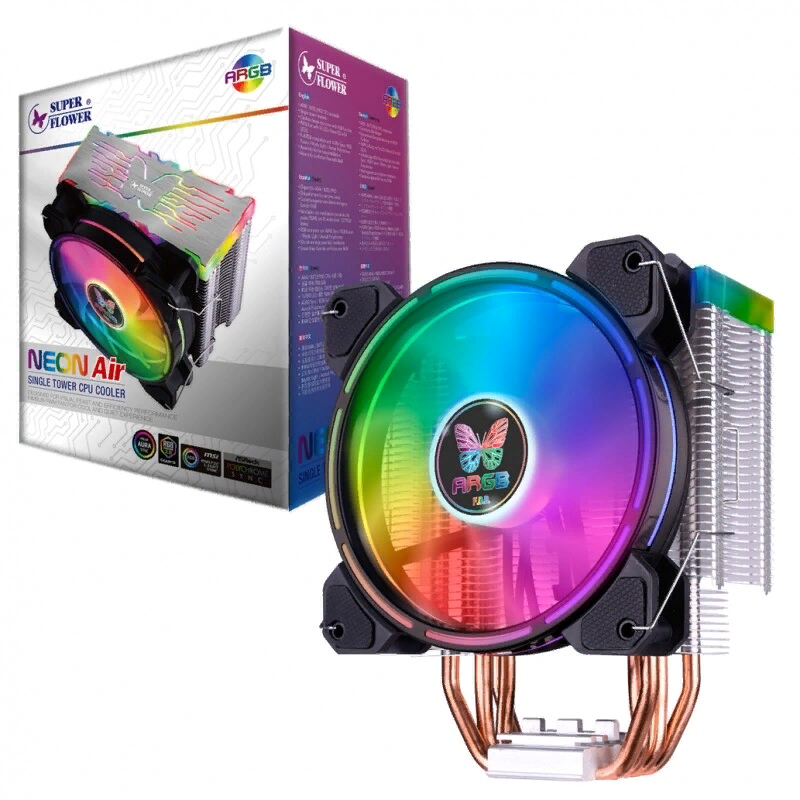 Компания Super Flower, больше известная блоками питания, вышла на рынок воздушных систем охлаждения процессоров с моделью Neon 122. Конструкция изделия включает алюминиевое основание, через которое пропущены четыре медные тепловые трубки диаметром 6 мм, средней частью непосредственно контактирующие с процессором. На концах трубок нанизаны