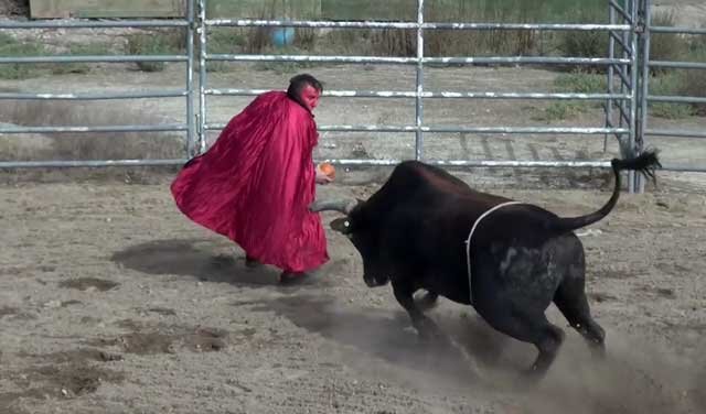 Красным полотнищем тореадор машет перед взглядом быка, что несомненно раздражает последнего. При этом животное подвергается постоянной атаке острых пик в свое тело. Истекающий кровью самец, на самом деле, уже может кидаться на противника и без мельтешащих перед взглядом предметов.
