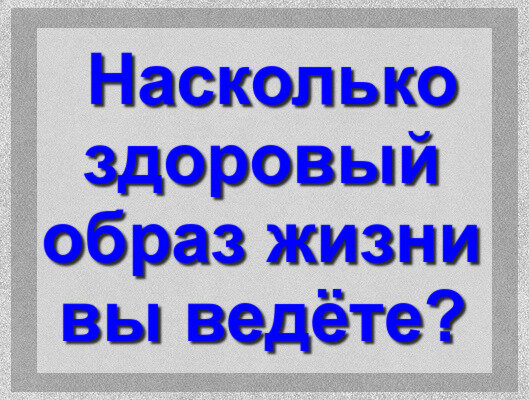 Нужно ли вести здоровый образ жизни, или это дань моде Здравствуйте, наши дорогие читатели! Сегодня у нас тест о здоровом образе жизни. Пройдём его, и узнаем, правильно ли мы живём, или нет. Я постоянно натыкаюсь на информацию, что можно кушать, а что нельзя, пить много воды или нет, как спать, какой должен быть распорядок жизни. И везде противоречивая информация: в одном источнике пишут одно, а в другом совсем другое. Так, что такое здоровый образ жизни? Заглянем в Википедию: " Здорóвый óбраз жи́зни, ЗОЖ — образ жизни человека, направленный на сохранение здоровья, профилактику болезней и укрепление человеческого организма в целом. Здоровье человека на 60 % и более зависит от образа жизни (еда, режим питания, физическая активность, уровень стресса, вредные привычки и разрушительное поведение). Здоровый образ жизни подразумевает ментальное здоровье, отказ от табака и употребления алкоголя, здоровые модели питания, физическую активность, физические упражнения, спор