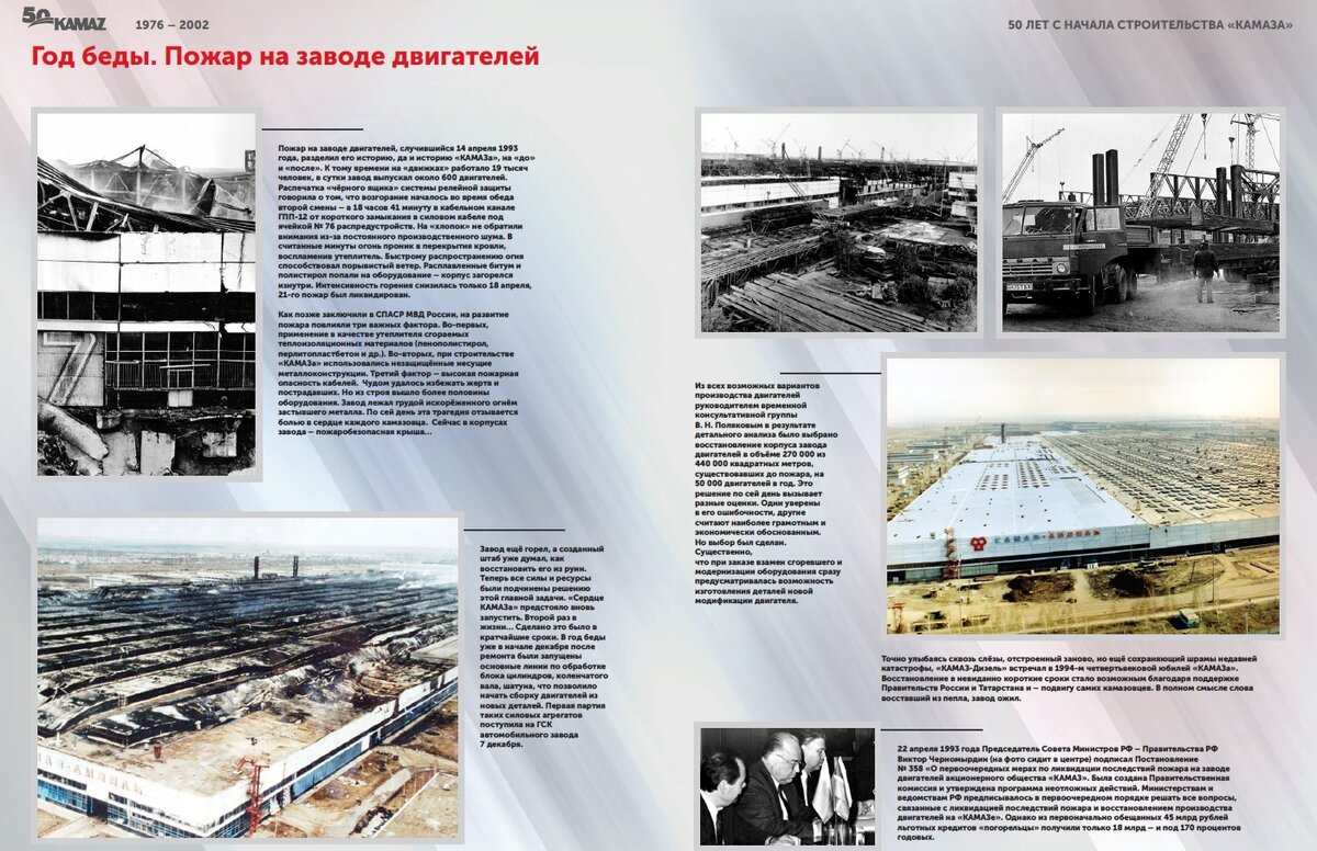 22 апреля 1993 года Председатель Совета Министров РФ – Правительства РФ Виктор Черномырдин подписал Постановление № 358 «О первоочередных мерах по ликвидации последствий пожара на заводе двигателей акционерного общества «КАМАЗ». Была создана Правительственная комиссия и утверждена программа неотложных действий. Министерствам и ведомствам РФ предписывалось в первоочередном порядке решать все вопросы, связанные с ликвидацией последствий пожара и восстановлением производства двигателей на «КАМАЗе». Однако из первоначально обещанных 45 млрд рублей льготных кредитов «погорельцы» получили только 18 млрд – и под 170 процентов годовых.