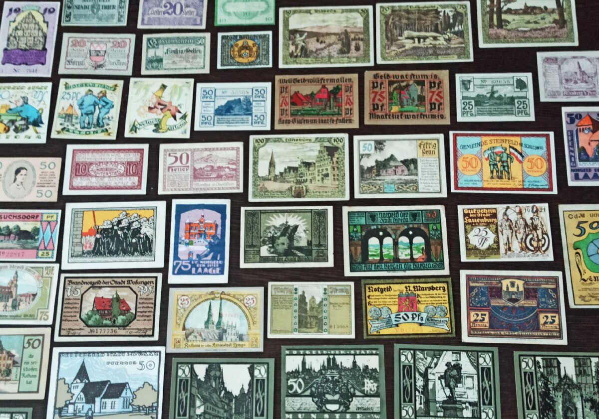 Однако Германия вступает в период жесточайшей гиперинфляции. Цены растут так быстро, что номиналы официальных денег не в состоянии обеспечивать денежный оборот. Дело доходило до того, что неразрезанными листами банкнот оклеивали стены вместо обоев, так как сами обои уже стоили дороже суммы номиналов, обозначенных на купюрах. В связи с инфляцией появляются номиналы в миллионы и миллиарды, а к концу 1923 года в ходу уже нотгельды с триллионами. Однако продолжают печатать и красочные «банкноты» мелких номиналов, но не для оборота, а для коллекционеров. Эрзац-деньги сами превращаются в товар.