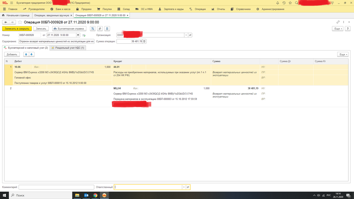 Решение: перепробовав пришедшие в голову варианты и перечитав много форумов, решение пришло само. Надо вернуть в учет материалы на счет учета 10.ХХ без указания стоимостных показателей, т.к. такие материалы уже списаны на расходы и не образуют заготовительную стоимость (себестоимость) вновь. Эту хозяйственную операцию необходимо оформить через "Операцию, введенную в ручную" (раздел меню "Операции" -> подраздел "Бухгалтерский учет" -> пункт "Операции, введенные вручную"). Не забываем про двойную запись, иначе программа просто не сформирует документ. Здесь мы использовали зеркальную проводку: Д-т 10.ХХ К-т 44.ХХ (20.ХХ, 26.ХХ) с нулевыми стоимостными показателями и здесь же исключаем из учета с забалансового счета эти же материалы по стоимости их учета простой одинарной записью: К-т МЦ.ХХ