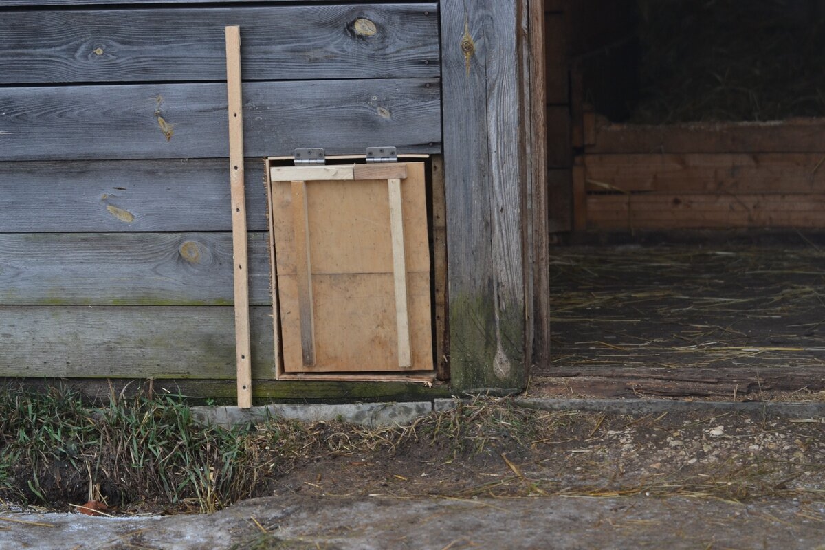 Через пару часов лаз был готов. Пока был без дверки и свисающей фанерки. Но в конюшне стало значительно теплее при закрытой двери.