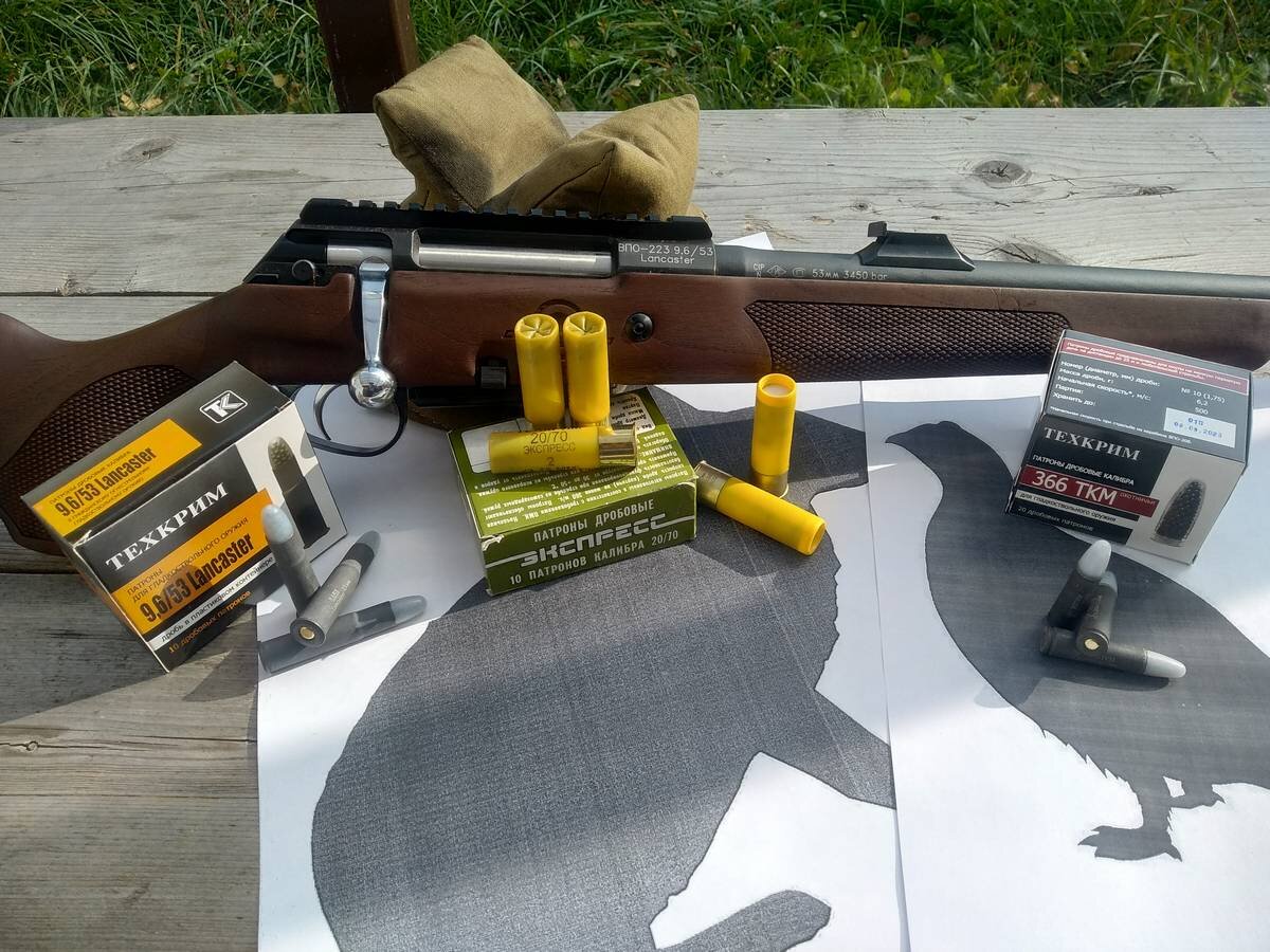 Итак, вернёмся к описанию эксперимента. 20-й калибр я прострелял на 2 дистанции: 35 и 25 м – чтобы определить тенденцию разброса дробового снопа именно на крупной дроби и картечи, так как мелкая дробь менее чувствительна. 9,6/53 Lancaster мы будем тестировать в паре с .410 калибром на дистанциях 35, 25 и 15 метров. .366 ТКМ – на 10, 15 и 25 м, так как дальше смысла стрелять нет ввиду малого диаметра дроби (быстро теряет скорость).