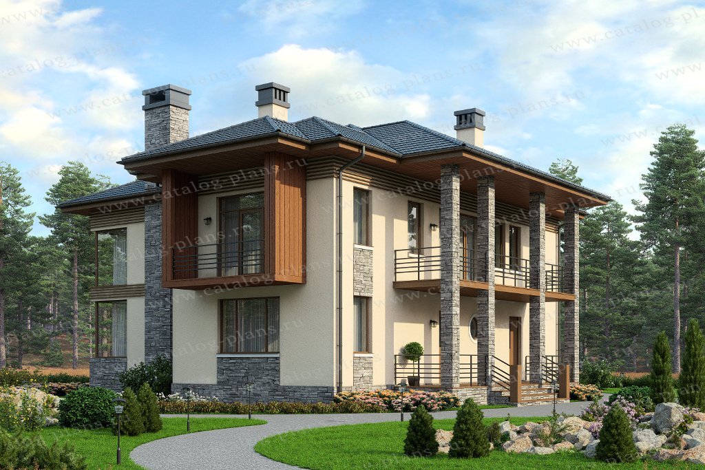 Дом выглядит очень стильно, особенно украшают его колонны, поддерживающие балкон, на главном фасаде. Дом выполняется из газобетона, а снаружи отделывается различными материалами, такими как штукатурка, искусственный камень и дерево. Габаритные размеры дома 13 х 14 метров.
