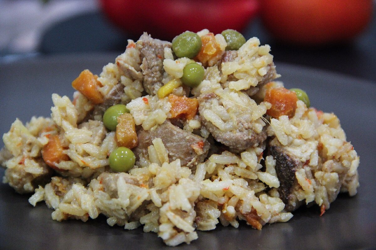 Как только мясо прожарилось, убираем его со сковороды на тарелку. Оставляя вытопленное сало на сковороде. Отправляем на сковороду порезанный лук. Далее морковь брусочками и перец пластинами. Добавляем зелёный горошек. Туда же трём на мелкой тёрке корень имбиря и в конце выдавливаем чеснок. Добавляем немного воды при необходимости и даём потушиться. Когда овощи станут мягкими, выкладываем к ним мясо, все перемешиваем, даём им "пожениться" или "познакомиться", кому как нравится) и добавляем рис. Все ещё раз перемешиваем. Выключаем огонь и оставляем минут на 10.