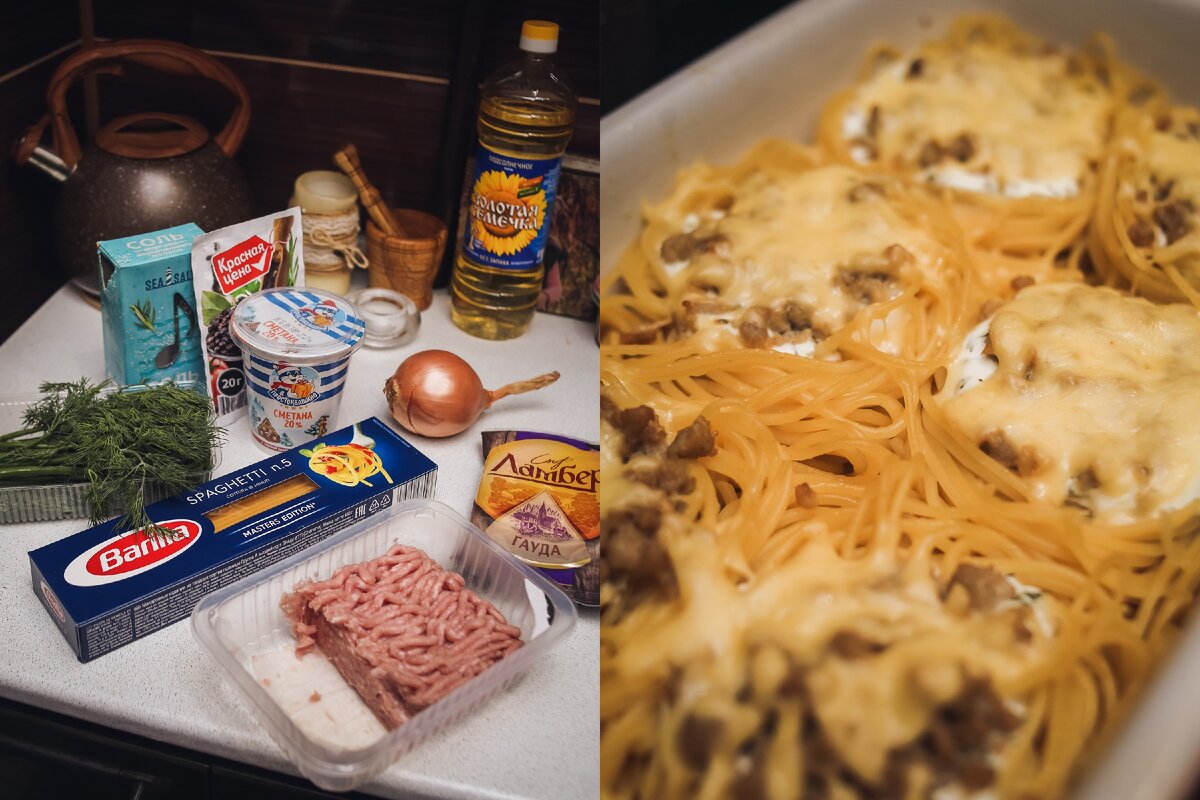 - Посуду для запекания смазать маслом, выложить спагетти "гнездами";