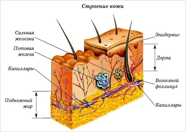 Кожа имеет три слоя - эпидермис, собственно кожа и подкожно жировой слой. Самый опасный для здоровья человека, это подкожно жировой слой, его вес 10 - 15 кг (полтора ведра) и больше всего в области живота, молочных желез, таза. Самое страшное, что у взрослых жир параллельно откладывается вокруг внутренних органов (даже больше), подкожно жировой слой убирается от диеты, физических нагрузок, а вот внутренний жир убрать сложно.