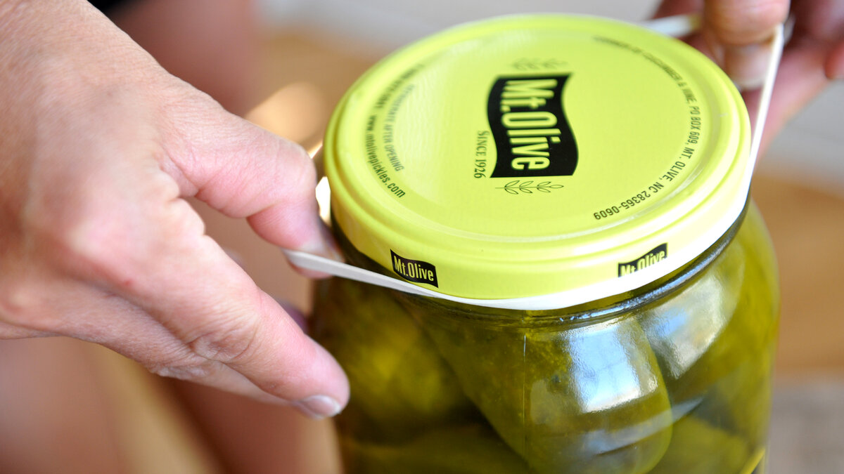Берем банку, переворачиваем, кончиком ножа проходим по кругу банки. После таких действий, она быстро откроется.
