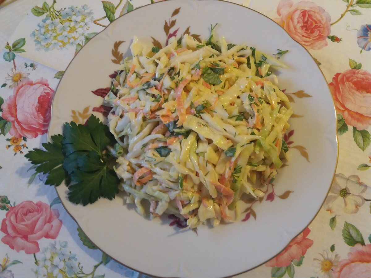 Этот салат из свежей капусты мне нравится простотой приготовления и приятным вкусом, благодаря наилучшему сочетанию продуктов. Изюминку добавляет вкус чеснока. Попробуйте, надеюсь Вам тоже понравится.
