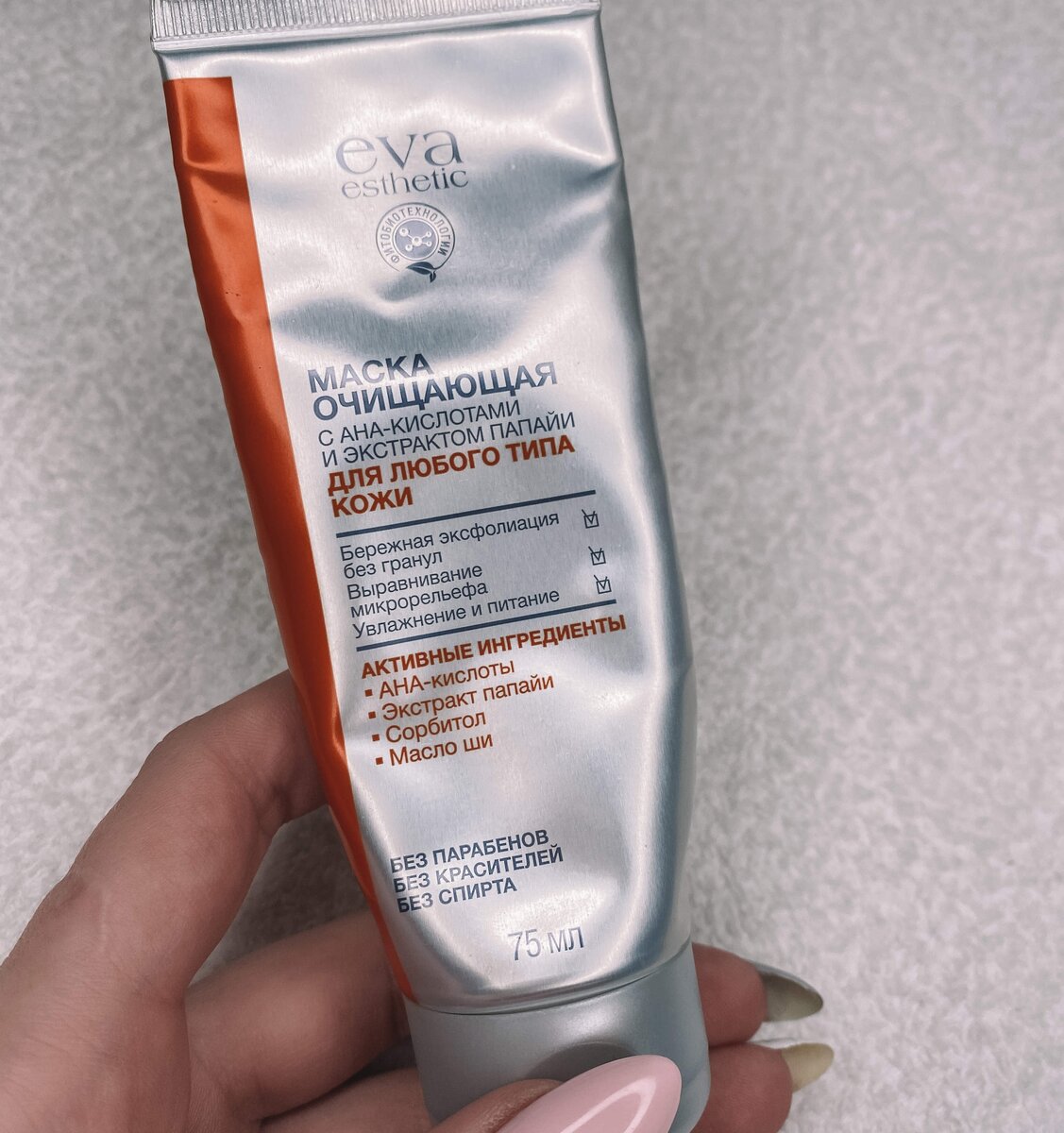 Содержит AHA кислоты и подходит для любого типа кожи, не содержит спирта и парабенов. Маска хороша тем, что действует всего за 3 минуты, наносится на влажное лицо, выдерживается и смывается теплой водой.
