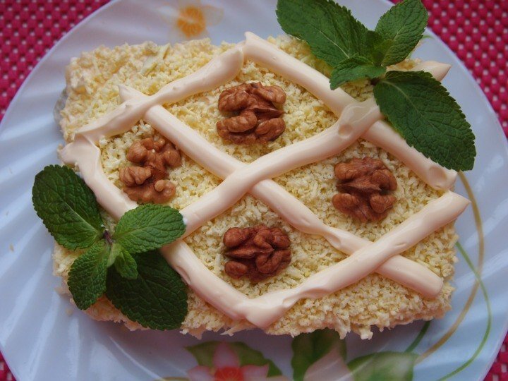 На дно выложить заранее сваренный кусочек свинины и измельченный в блендере с зеленью. Смазать майонезом.Сверху выложить соленые огурчики, порезанные колечками и смазать майонезом.Далее потереть на крупной терке заранее сваренные яйца и опять промазать майонезом.Сверху посыпать натертым на крупной терке