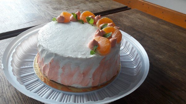После того, как наш торт собран, можно обмазать его оставшейся массой как я, чтобы никто не видел что внутри и украсить мандаринами.
