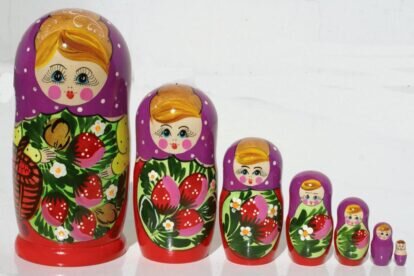 Версия третья – японскую фигурку будто бы привезли с острова Хонсю в 1890 году в подмосковную усадьбу Мамонтовых в Абрамцево. «Японская игрушка была с секретом: в старичке Фукуруму пряталась вся его семья. В одну из сред, когда в усадьбу наезжала художественная элита, хозяйка показала всем забавную фигурку. Разъёмная игрушка заинтересовала художника Сергея Малютина, и он решил сделать нечто подобное. Японское божество он, конечно, повторять не стал, сделал эскиз круглолицей крестьянской барышни в цветастом платочке. А чтобы она выглядела поделовитее, пририсовал ей в руку чёрного петуха. Следующая барышня была с серпом в руке. Еще одна – с караваем хлеба. Как же сестричкам без братца – и он появился в расписной рубахе. Целое семейство, дружное и трудолюбивое.