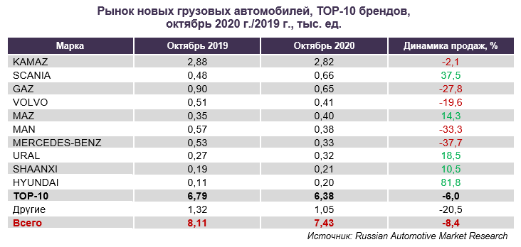 В октябре 2020 г. продажи новой грузовой техники сократились на 8,4% относительно октября 2019 г. и составили 7,43 тыс. ед.