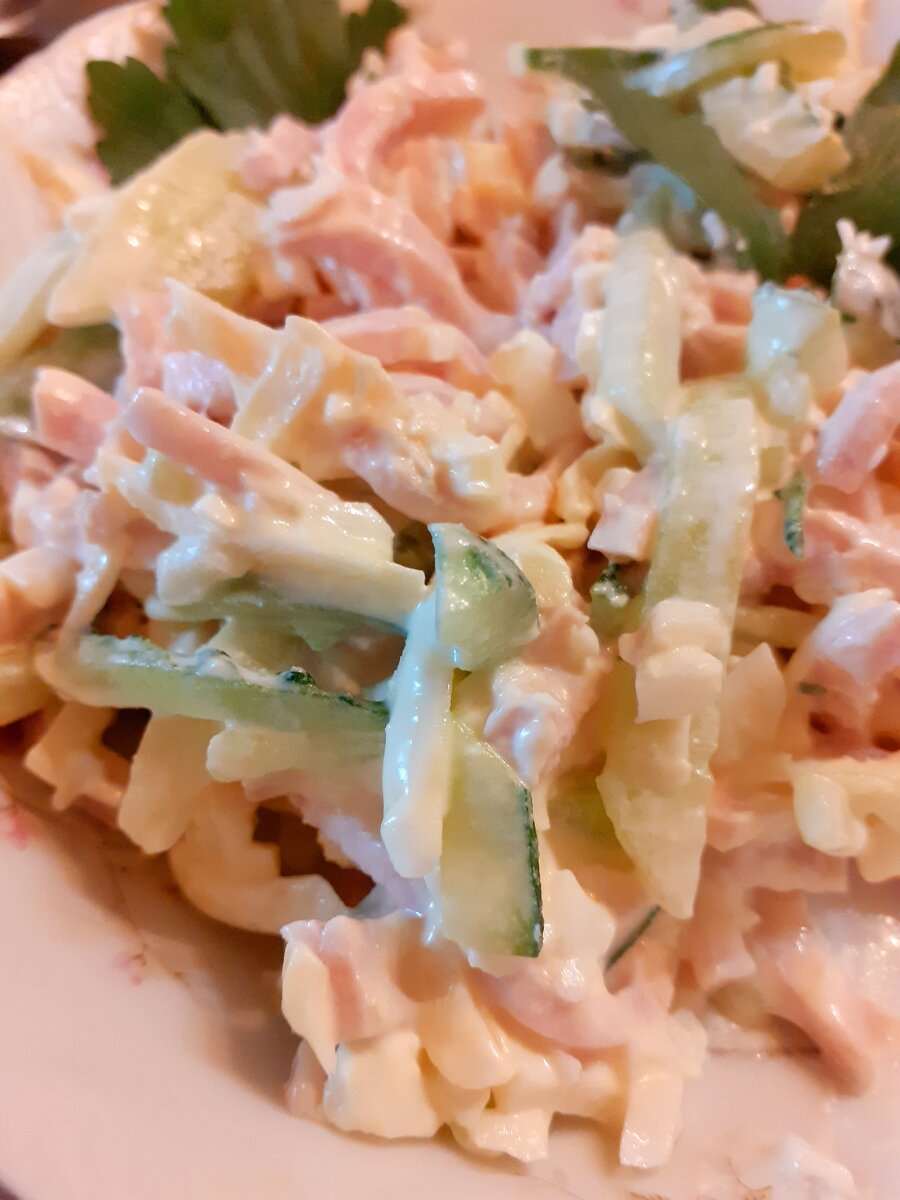 Простой рецепт. Время приготовления 10 минут. Результат ооочень хороший. 1. Ветчину нарезаю соломкой. 2. Свежий огурчик режу соломкой. 3. Яйцо мелко нарезаю. 4. Добавляю натертый на крупной терке сыр. Перемешиваю и заправляю майонезом. Приятного аппетита! Хорошего настроения! Спасибо, что дочитали до конца, не забудьте поставить "пальчик вверх" и поделиться рецептом с друзьями:) До новых встреч на канале "Кулинарный блокнот Екатерины".