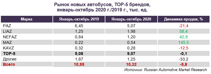 По итогам десяти месяцев 2020 г. продажи автобусов лидера рынка – бренда PAZ - сократились на ...
