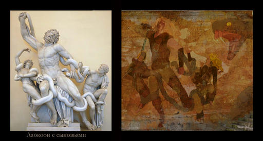 1) По другую от «Ведьмака Георгия» сторону дверного проема находится еще одна картина со змеями. Геральт, подходя к ней, говорит: «Кажется, ведьмаки всегда лучше управлялись с мечом, чем с кистью». Поза человека, изображенного на картине, идентична скульптуре Лаокоона с сыновьями, сражающимися со змеями.