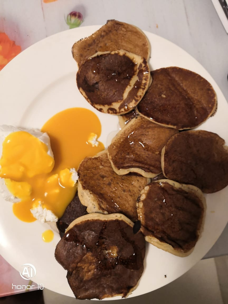 Банановые панкейки на овсяной муке (молотая овсянка, банан, яйцо), творог с манговым пюре, все полито чайной ложкой сиропа цикория.