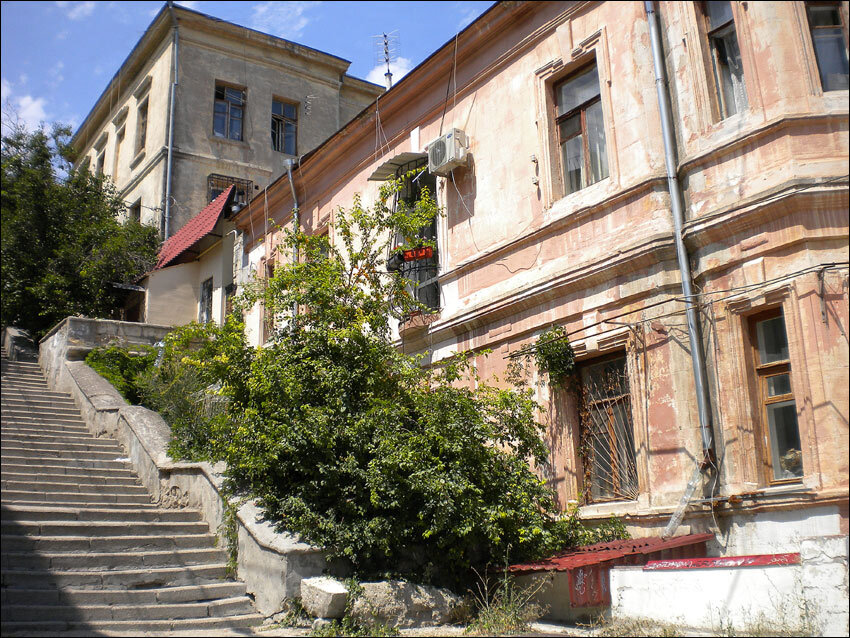 Моя излюбленная Адмиральская горка, с ее крутыми подъемами, мощеными булыжником и брусчаткой, бесконечные лестницы, зеленые улочки и тихие дворики... Если свернуть на такую лесенку за зеленой завесой, можно попасть в уютный дворик, где есть свои лесенки: В этих местах сохранились булыжные мостовые, как говорят, уложенные еще пленными немцами: Вот современная вилла: Но за теми кипарисами забор, а за забором патриархальный южный дворик - При этом Севастополь остается в первую очередь морским и военным городом, поэтому столь часты на его улицах якоря: А то и якоря в сочетании с минами, снарядами или пушками : На этих улочках неизбежны встречи с севастопольскими котами, которые: охотятся (только все равно ничего не получится :) Возлежат на тротуарах: По неосторожности попадают в руки младенцев, но стоически выносят это испытание: Не желаете ли свой портрет за 15 минут? Нет? Очень жаль... ( эдак с вами вконец отощаешь) Лето, солнышко, рядом море - это здорово! На Графской пристани - фотомод
