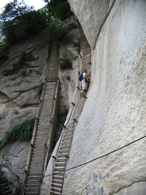 Hua Shan (Цветочная гора) является одной из восьми священных гор Китая. Миллионы китайцев проходят эту лестницу ,чтобы попасть в храмы. Которые находятся на вершинах скал. Туда идут не только в храмы, но и полюбоваться головокружительными красотами, открывающимися по дороге.
