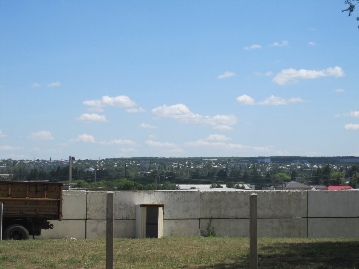 Начинаем по порядку. Гаражи, забор, столбы с проводами. Прекрасный вид на местность внизу. Гаражи очень кстати, парковаться реально негде.