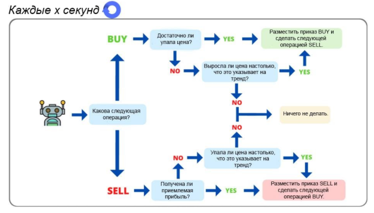 - Бот сможет пребывать лишь в одном из двух состояний: BUY (покупка) или SELL (продажа). Он не будет постоянно размещать заявки на покупку или на продажу по разным ценам. Если последней операцией была продажа, то следующей операцией, которую попытается выполнить бот, будет покупка.