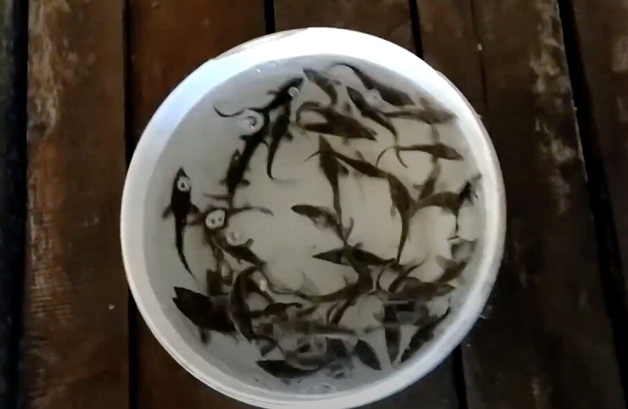 Далее садков вылавливали из бассейна малька в вёдра, и повторяли это часа 3. Малька мы переливали в специальные емкости, установленные на грузовой машине. Вода в них была заранее насыщена кислородом, а толстые термостойкие стенки не дадут температуре сильно скакать при перевозке