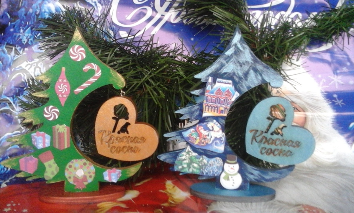 Волонтеры приюта «Красная сосна» занимаются не только социализацией и пристройством собак. Каждый раз, когда заболевает очередная собака, мы думаем, как добыть средства на лечение. Мы не только просим в соц.сетях помощи, но и работаем руками. Кто-то вяжет зверушек, кто-то проводит аукционы. Одной из статей дохода стала продажа новогодних сувениров. Их придумали мастерить наши затейники — Валерия и Алексей. Ребята рисуют макеты, каждый год добавляется что-то новое. Затем заказывают заготовки, а потом начинается полет мысли небольшой команды умельцев.