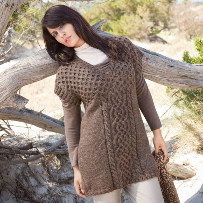 Вам потребуется: пряжа (50% беби альпака, 50% шерсть; 200 м/ 100 г) — 500 (600-600-700) г коричневой; спицы №5 и 5,5.