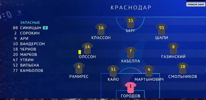 У"Краснодара" состав был лучше, чем в предыдущем матче, появились лидеры: Кабелла, Классон, Берг, Олссон, Рамирес. Но на воротах не было Сафонова, который продолжает находиться в изоляции в Стамбуле, а на воротах стал Городов.