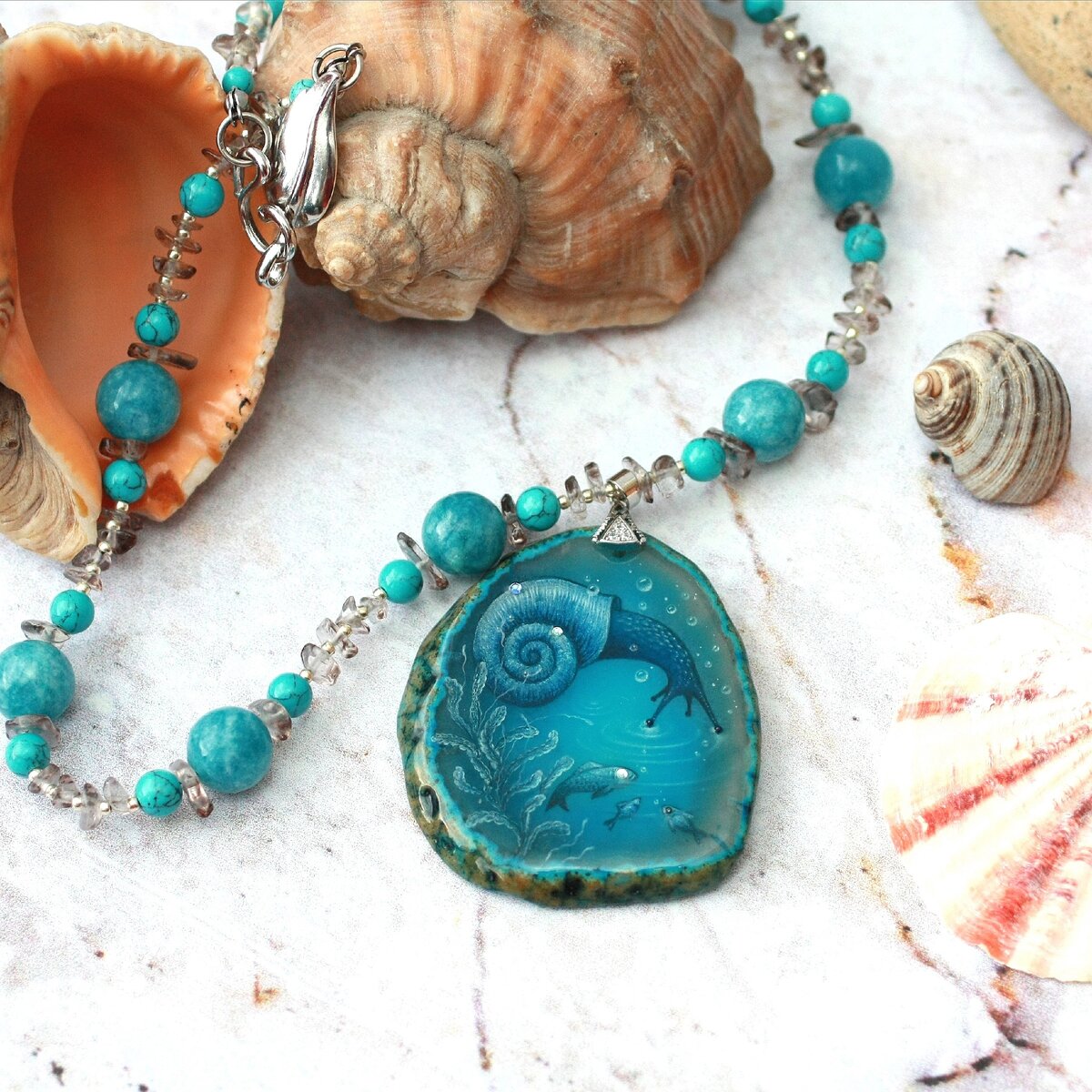 Улиточка написана на голубом агате и собрана в колье с кальцитами и кварцем.
