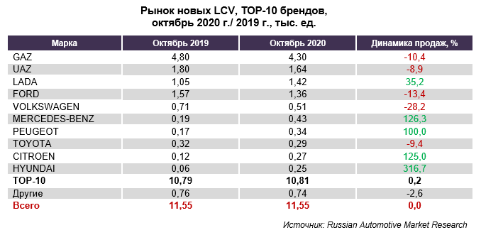 Рынок новых LCV в октябре показал лучший результат за 2020 г. - 11,55 тыс. ед. Такой же спрос на новые LCV был отмечен в октябре 2019 г.