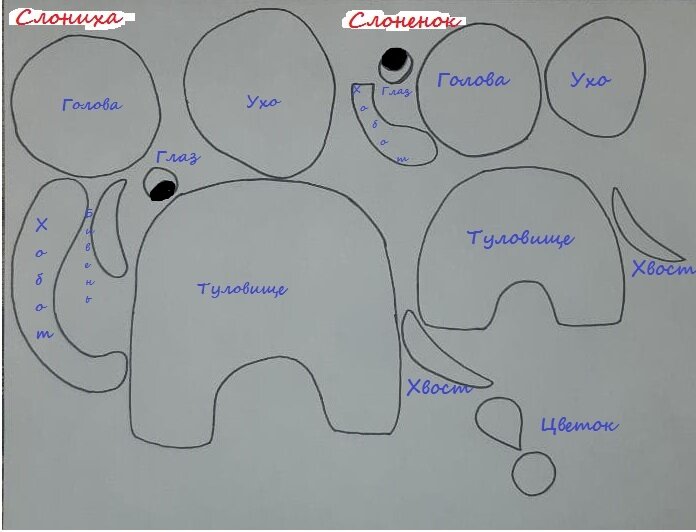 Переводим детали на цветную бумагу. Я делала слониху синим, а слоненка голубым цветом.