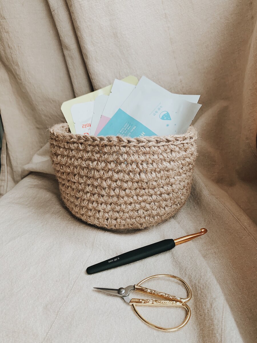 Джутовая корзиночка - отличный интерьерный аксессуар и просто превосходный подарок. Вяжется просто и быстро, материалы стоят дешево. И, научившись однажды, сразу хочется вязать эти корзиночки одну за одной, одну за одной.