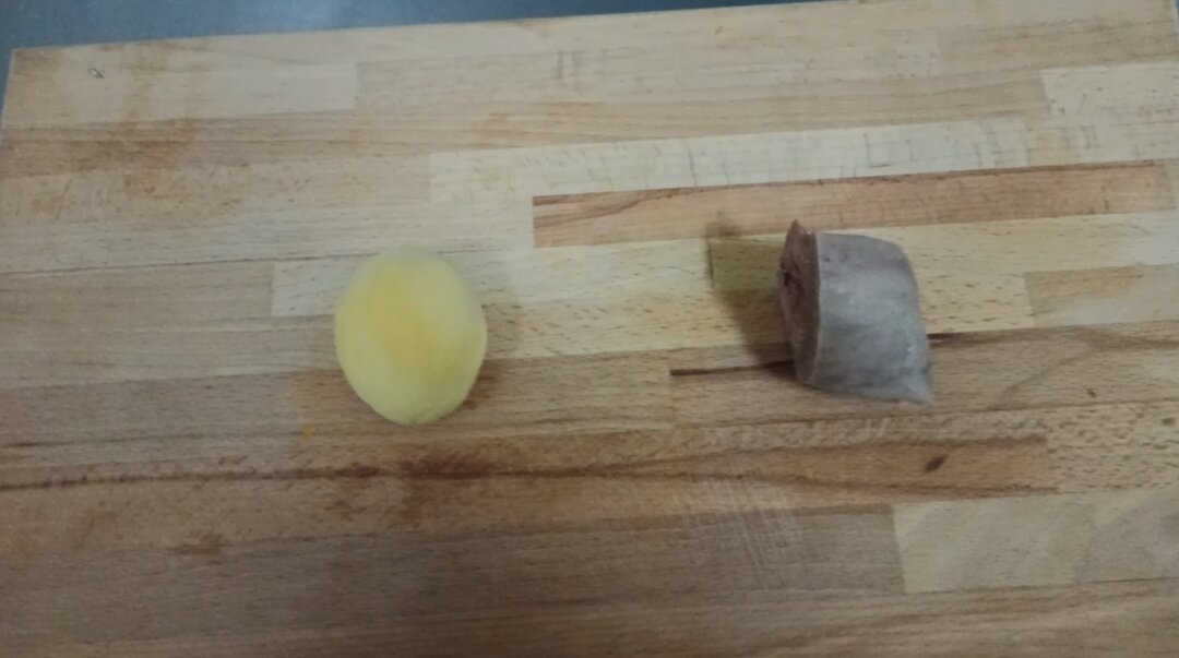 Берём отварной язык и картофель и красиво нарезаем на равные количество частей.