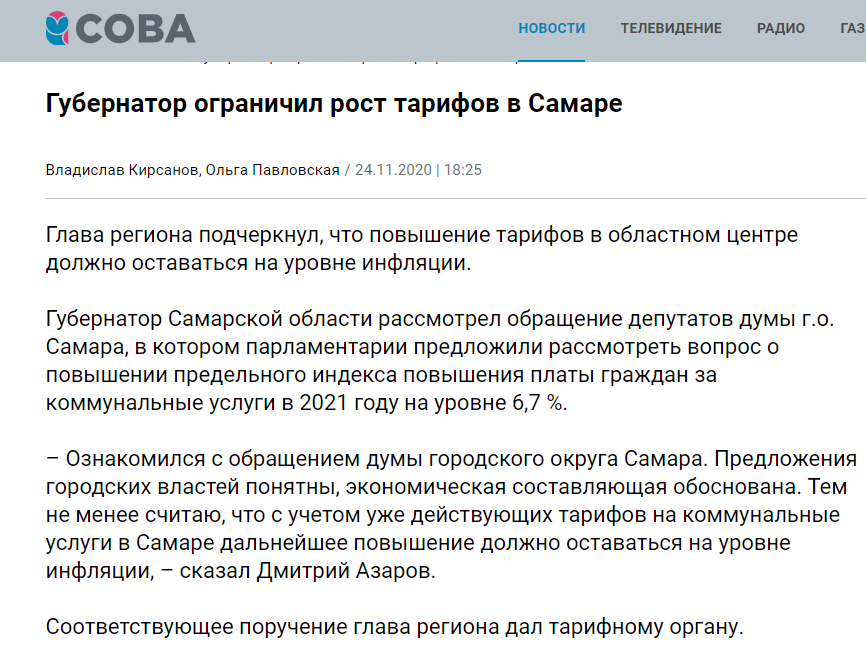 Вчера в ряде СМИ была опубликована радостная новость - губернатор Самарской области ограничил рост тарифов в Самаре. Вместо предлагаемого Думой столицы региона повышения тарифов на ЖКХ в размере 6,7%, Дмитрий Азаров ограничился уровнем инфляции. Но мало кто задумывался о причинах и последствиях этого решения. Предлагаю вместе попытаться разобраться в сложившейся ситуации. Итак, 30 октября 2020 г. председатель правительства РФ Михаил Мишустин подписал распоряжение, которым были утверждены «индексы изменения размера вносимой гражданами платы за коммунальные услуги» по регионам страны. Согласно распоряжению премьер-министра, в Самарской области «средний индекс» изменения квартплаты во II полугодии должен составить 3,6%. 5 ноября Дума г. о. Самара собралась на пленарное заседание, где проголосовала за решение обратиться к губернатору с просьбой рассмотреть вопрос об установлении в г. о. Самара предельного (максимального) индекса изменения размера вносимой гражданами платы за коммунальные