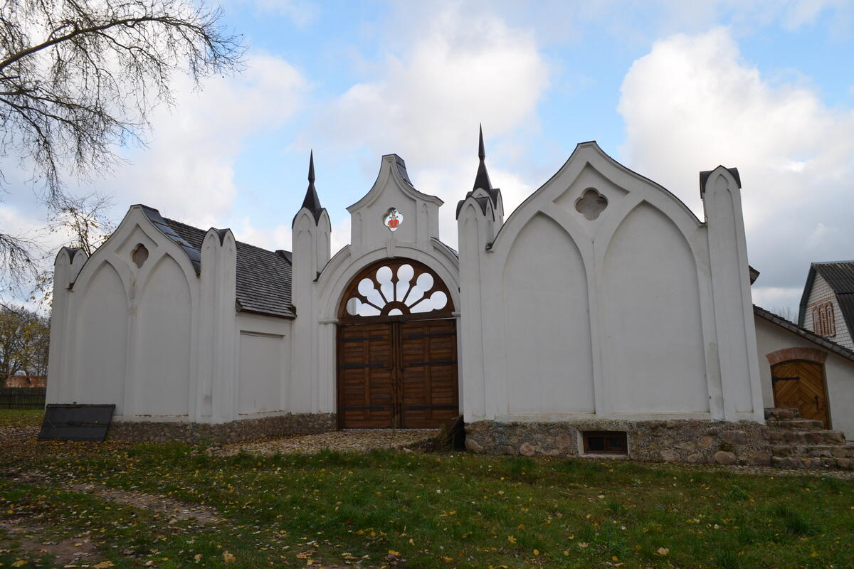 Обновленной встречает въездная брама в усадьбу и каретный сарай, вокруг них выложена бутовая отмостка и участок въездной дороги. Строительные материалы говорят о том, что здесь ведутся восстановительные работы усадебного дома и оранжереи. Это нам подтвердили и в местном музее. На плакатах на въезде — информация о том, что здесь планируется открытие музейной экспозиции, рассказывающей о жизни и деятельности Якова Оттоновича Наркевича-Иодко и об истории усадьбы. Предметы для музея собраны. Это коллекция научного и прикладного оборудования ХIХ века, соответствующая периоду и тематике деятельности ученого.