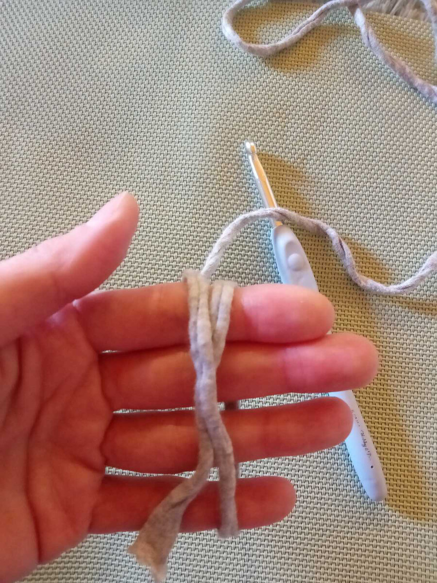 Для начала сделаем так называемое "волшебное кольцо". Ниточку кладём на руку и оборачиваем ею пальцы (1 фото). Крючок подводим под первую нить (2 фото), подхватываем рабочую нить (3 фото) и, сквозь петлю на крючке, провязываем рабочую нить (4 фото). Получится колечко с хвостиком (5 фото).