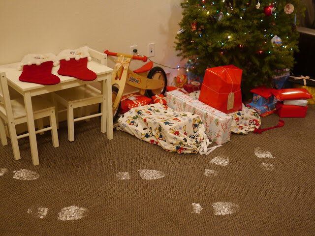 Конечно, для большей убедительности стоит создать следы, ведущие из коридора к ёлочке с подарками, а то и на порожках парочку оставить.