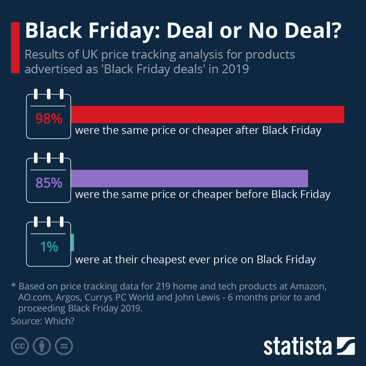98% товаров, продававшихся как товары со скидкой, были не дороже после "распродажи". 85% были не дороже и ДО "распродажи". И только 1% (один процент. Один) действительно стоили дешевле всего именно в Чёрную Пятницу.