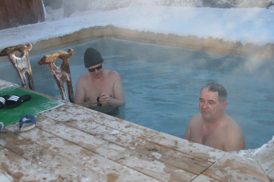 Такой бассейн имелся и во дворе гостевого дома, в котором мы остановились. Следует ли уточнять, куда именно мы отправились сразу по прибытии? Правильно — в теплый санузел. Зато сразу после него — в бассейн. Там даже образовалась некоторая давка. Дело в том, что посещать зимой термальные бассейны можно только трезвым, потому как перепад температуры от минус 25 градусов по Цельсию на улице до плюс 42 в бассейне — очень серьезная нагрузка на сердце. Тут лучше не рисковать, поэтому все торопились быстренько накупаться и переместиться в просторный обеденный зал. Где мы стремительно создали уют, а именно повесили на стену флаг клуба и равномерно расставили по столу еду и напитки. Дальше все по привычной схеме. Тосты за дружбу между московскими и петропавловск-камчатскими джиперами. Веселые и громкие песни под гитару, очень веселые и очень громкие песни без гитары, спорадический треп на разные темы. Да что я вам рассказываю, сами, что ли, никогда не сидели за праздничным столом в компании друзей?