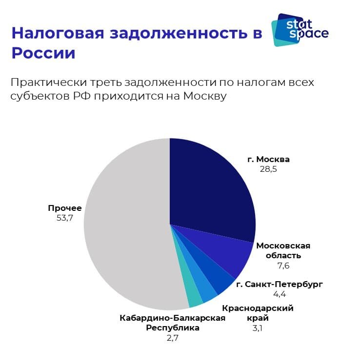 Среди лидеров по задолженности - город-герой Москва, где консолидированный бюджет не досчитался почти 565 млрд рублей (28.5% от общей задолженности по всем субъектам). Большая часть задолженности приходится на федеральные налоги и сборы, а также пени и штрафы по ним.