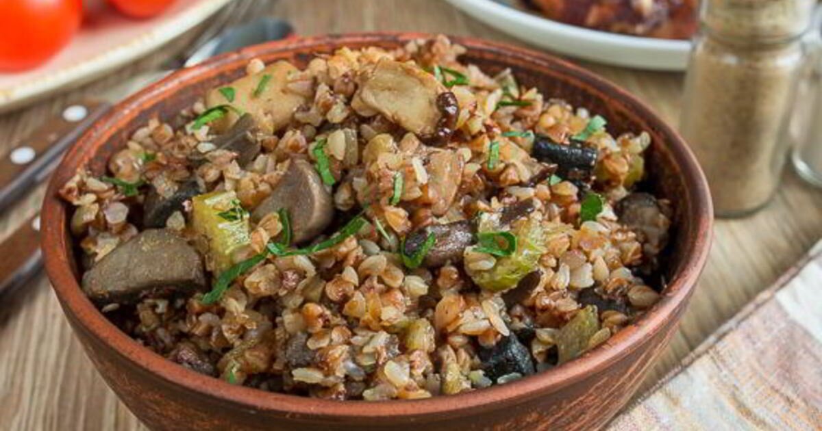Гречку с грибами и луком хорошо перемешиваем , держим на огне 5 минут и отключаем огонь. Закрываем крышкой ,даем настояться 5 минут. Можно подавать к столу .
