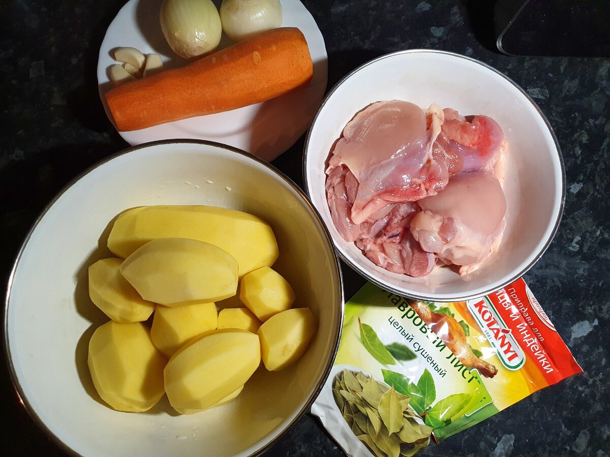 Всем привет! Думаю, у каждого случалось, что времени на готовку нет, а приготовить что-то надо, чтобы и вкусное, и сытное, а главное побыстрее! У меня на этот случай есть рецепт, который выручал меня не раз. Набор продуктов элементарный: картофель, морковь, лук, чеснок и курица (вкуснее всего получается с бедром без кости или куриными ножками). И, конечно же, Ваши любимые специи! Сначала ставим кастрюлю на небольшую мощность плиты, наливаем немного растительного масла. Далее режем лук, морковь и отправляем в кастрюлю немного потушиться. Через пару минут отправляем к овощам нарезанный чеснок и тушим, периодически перемешивая. В это время натираем курицу солью, специями и режем на средние кусочки. И выкладываем курицу на овощи. Далее режем картошку на средние дольки и выкладываем сверху курицы. Теперь подсолим, добавим специи, перец горошком и лавровый лист и зальём водой так, чтобы она немного не доходила до краёв картошки. Полностью картошку покрывать не надо. И сверху положим кусо