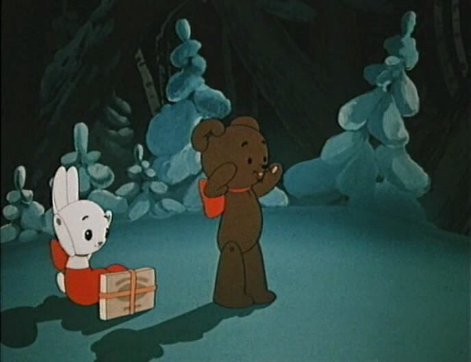 1. "Когда зажигаются ёлки" 1950 года. Прошло всего 5 лет после войны, а для детей снимают мультфильм - сказку. Дед Мороз спешит к ребятам, но у него из мешка вываливаются игрушки, предназначенные для девочки Люси и её брата Вани. Мишке и Зайчику предстоит пройти ряд приключений, прежде чем добраться до детей.