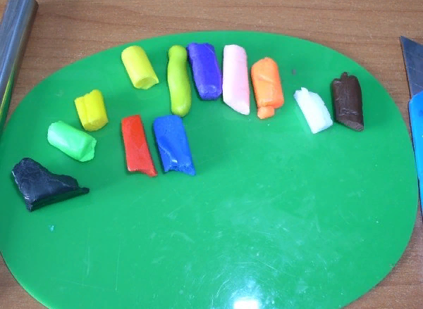 Итак, нужно взять досточку для лепки и подготовить глину необходимых цветов, стек и трубочку (скалку) для раскатывания. Для данного браслета нужна глина самых разных, самых ярких оттенков – чем разнообразнее – тем лучше. (Купить ее сейчас не проблема).
